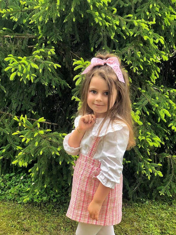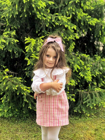 Update your little one's wardrobe with this peter pan collar outfit. This chic peter pan lace collar fastens up with front buttons down and elastic frilled cuffs. Comes in a set of suspender skirt. The skirt features a cotton blend composition and supportive shoulder straps for added versatility and styling.